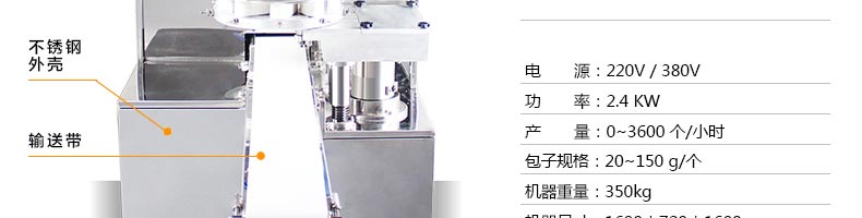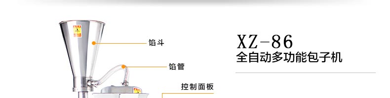 XZ-86型全自动包子机,可生产各种肉包、菜包、肉菜包、小笼包、汤包、水晶包、圆馒头、奶黄包、豆沙包、叉烧包、南瓜饼、煎堆等十几种包馅制品。适用于宾馆、饭店、学校、机关企业食堂、馒头或包子加工厂、早餐工程店及速冻食品厂等单位。可满足不同客户群体。免费提供工艺技术。免费上门培训指导安装。