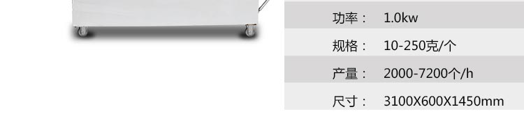 名称MP800型刀切馒头成型机 电源220/380V(见机器名牌) 功率1.0kw 产量2000-7200个/小时 尺寸3700*600*1380mm 重量380kg 规格10-250克/个 其他单段压面