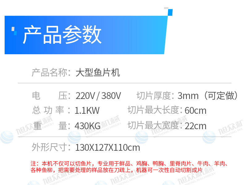 名称大型切鱼片机(自动进料) 电源380V 功率2.1kw 产量1吨以上/日 尺寸130*127*110cm 重量430kg 规格切片厚度3毫米(可定制) 其他伺服电机,可编程逻辑控制器